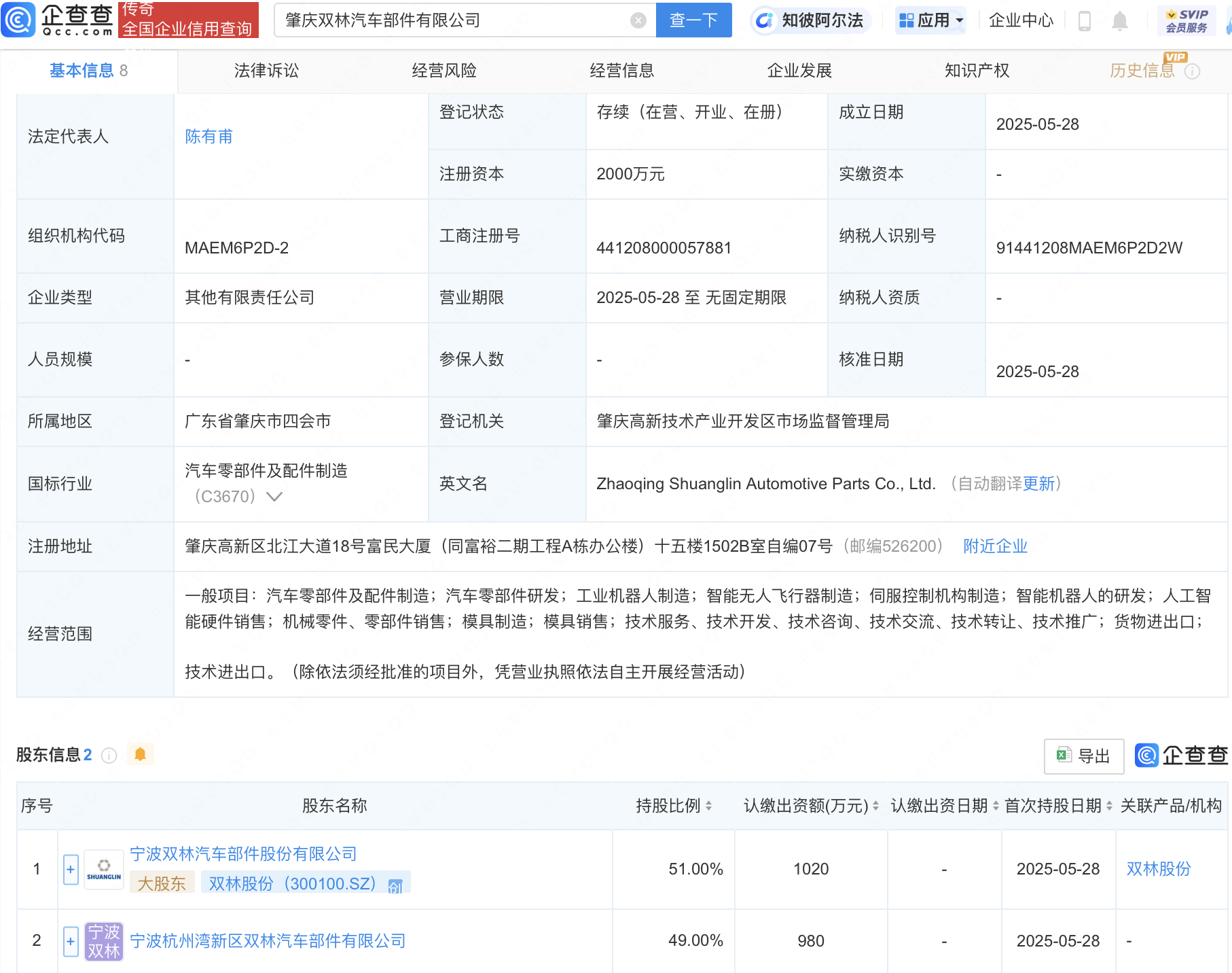 企查查APP显示,近日,肇庆双林汽车部件有限公司成立,法定代表人为陈有甫,注册资本2000万元,经营范围包含:工业机器人制造;智能无人飞行器制造;智能机器人的研发;人工智能硬件销售等。企查查股权穿透显示,该公司由双林股份(300100)等共同持股。