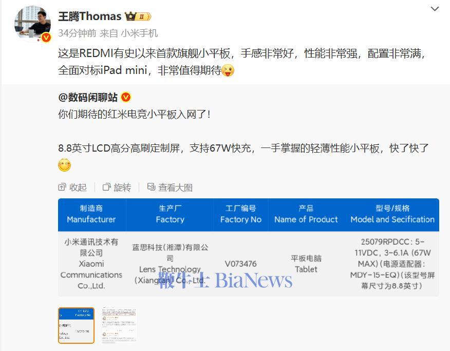 6月4日,小米中国区市场部总经理、REDMI品牌总经理王腾在微博上发布REDMI首款旗舰小平板的相关信息。