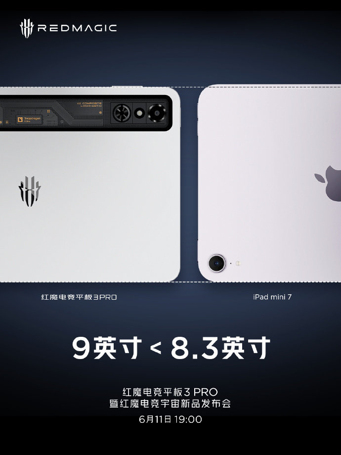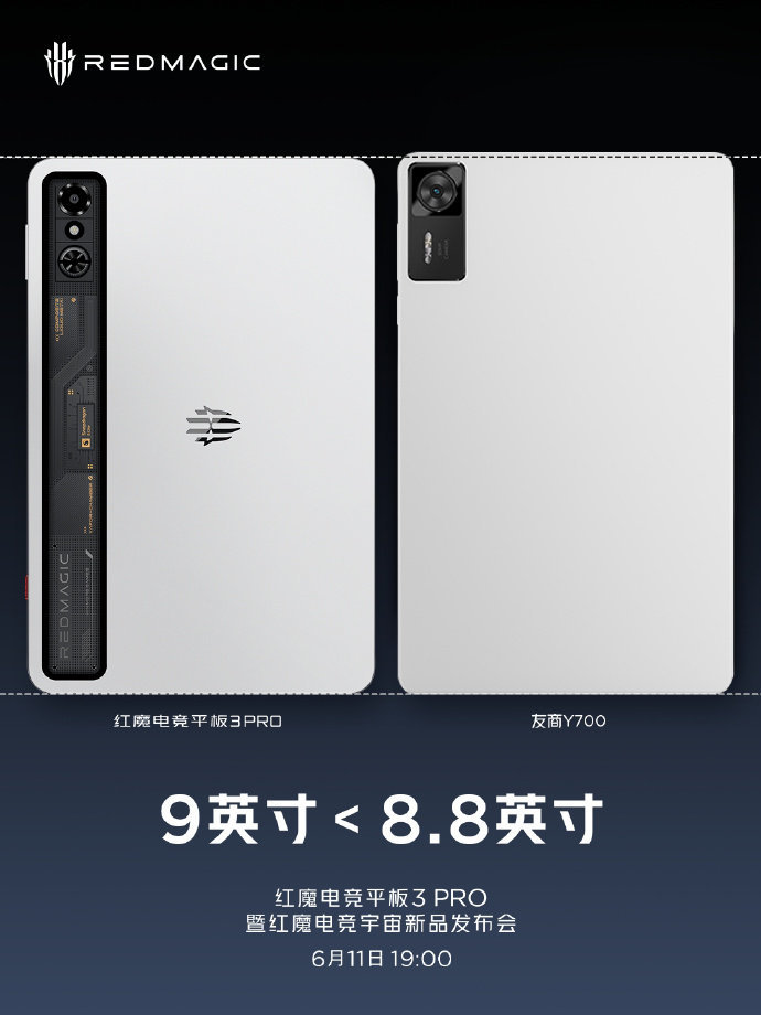 同时红魔还放出了与市面上两款小尺寸平板联想 Y700、iPad mini 7 的对比图。
