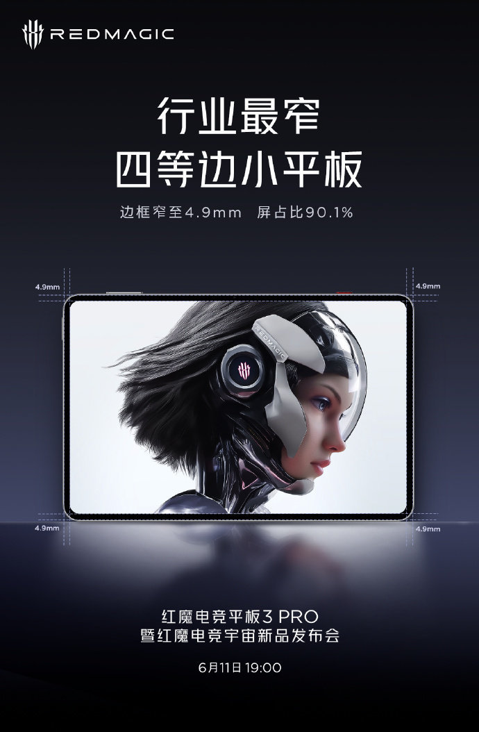 官方预告红魔电竞平板 3 Pro将会是“行业最窄四等边小平板”,边框窄至 4.9mm ,屏占比高达 90.1% ,窄边高屏占比带来更强的视觉体验。