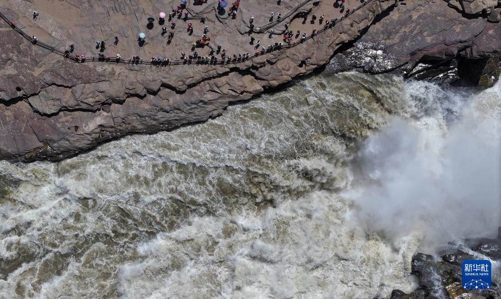 夏日时节,在位于晋陕交界处的黄河壶口瀑布景区,气势磅礴的黄河水如万马奔腾,壮美景观吸引游人驻足游览。
