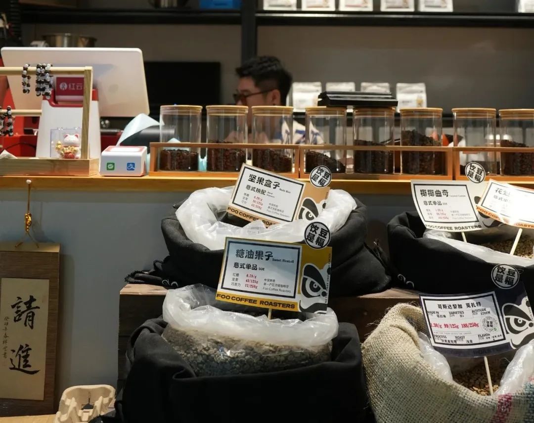 顾客自行挑选,店员现场称重制作,操作区后还摆着包装好的咖啡豆供零售。