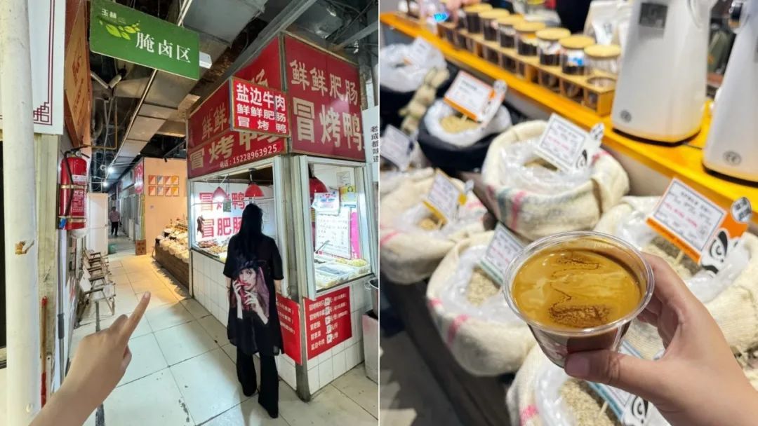 这家店位于成都玉林综合市场,是夹在烤鸭铺和羊肉汤铺中间的一个开放式档口,网友调侃“十分割裂的存在”。