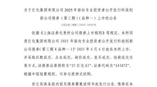 依据《上海证券交易所公司债券上市规则》等规定,上交所同意巨化集团有限公司2025年面向专业投资者公开发行科技创新公司债券(第三期)(品种一)于2025年6月6日起在上交所上市,并采取匹配成交、点击成交、询价成交、竞买成交、协商成交交易方式。该债券证券简称为“25巨化K5”,证券代码为“243072”。根据中国结算规则,可参与质押式回购。