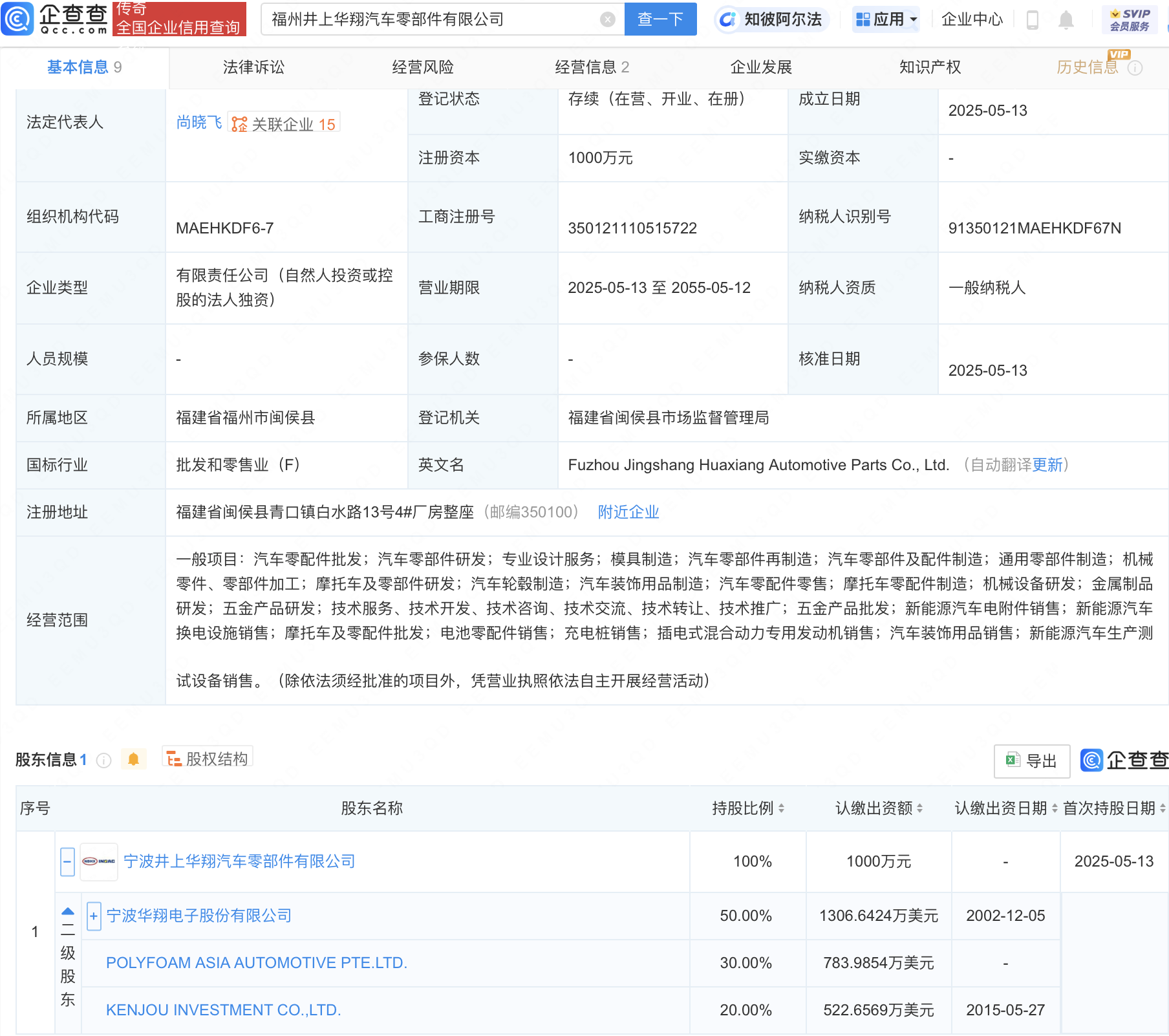 企查查APP显示,近日,福州井上华翔汽车零部件有限公司成立,法定代表人为尚晓飞,经营范围包含:汽车零配件批发;汽车零部件研发;专业设计服务;模具制造;汽车零部件再制造等。企查查股权穿透显示,该公司由宁波井上华翔汽车零部件有限公司全资持股,后者大股东为宁波华翔(002048)。