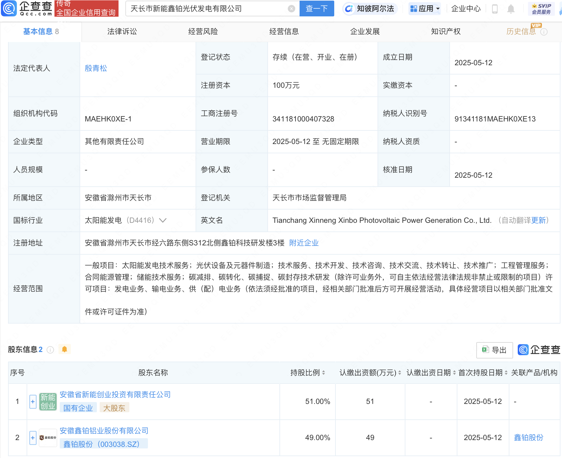 企查查APP显示,近日,天长市新能鑫铂光伏发电有限公司成立,法定代表人为殷青松,经营范围包含:太阳能发电技术服务;光伏设备及元器件制造;碳减排、碳转化、碳捕捉、碳封存技术研发等。企查查股权穿透显示,该公司由鑫铂股份(003038)等共同持股。