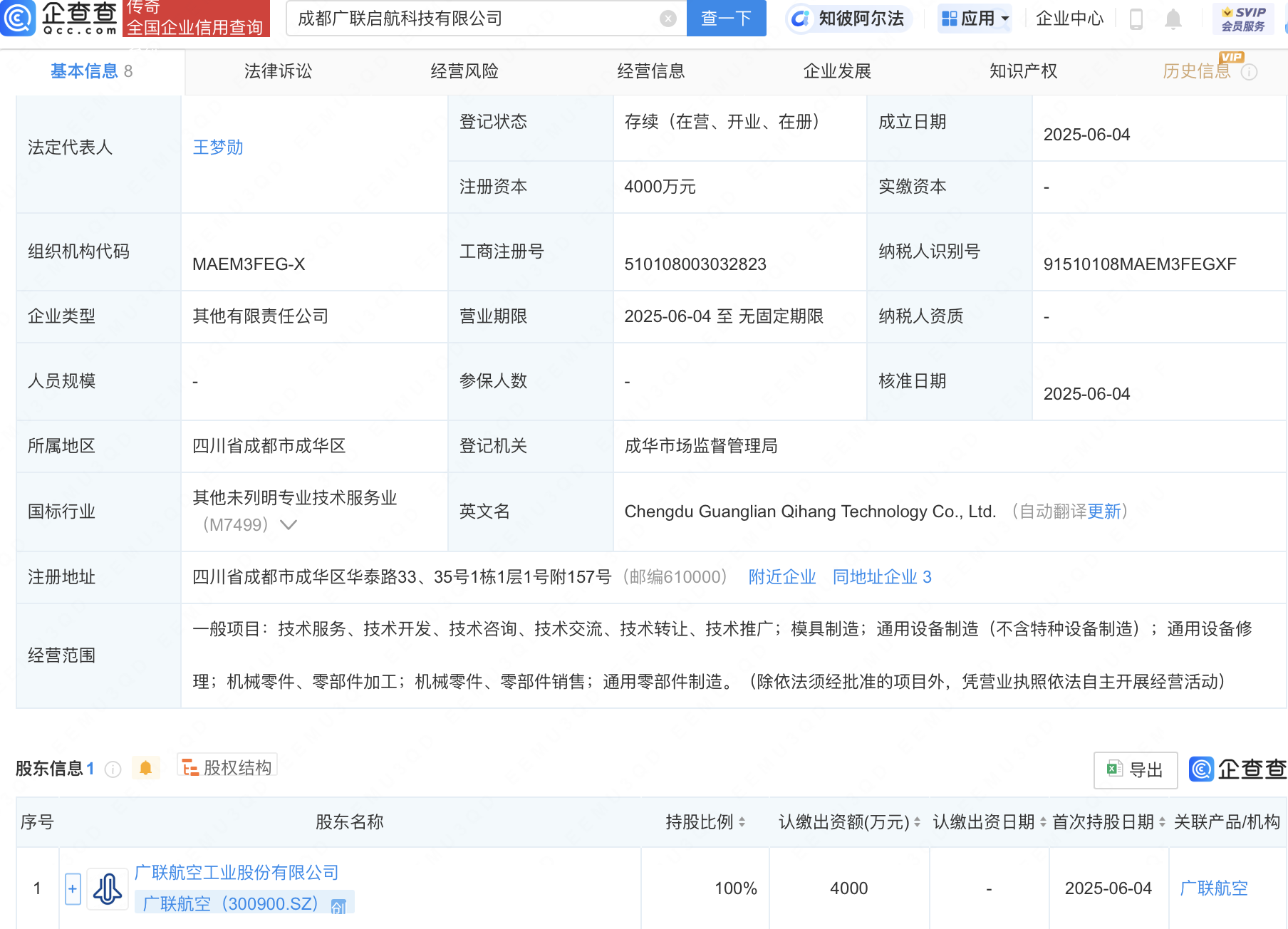 企查查APP显示,近日,成都广联启航科技有限公司成立,法定代表人为王梦勋,注册资本4000万元,经营范围包含:通用设备修理;机械零件、零部件加工;机械零件、零部件销售等。企查查股权穿透显示,该公司由广联航空(300900)全资持股。