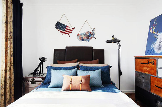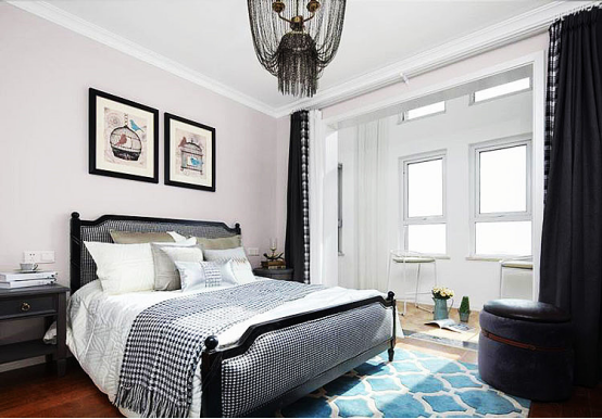 次卧,简洁与轻奢相结合。蓝色床品与白色相配,定位清新、优雅。背景墙的“星条旗