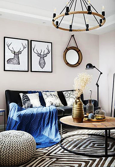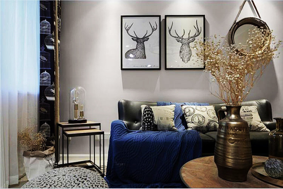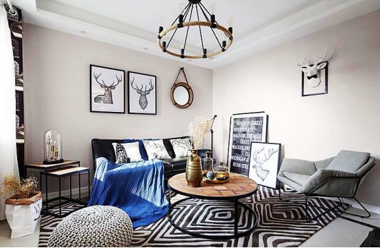 客厅即是浓浓的美式风,实木家具搭配布艺软装,给人温馨、耳目一新的感觉。棉麻感的布艺沙发加入蓝白元素的毛巾毯和靠枕,温暖而舒适。墙上的鹿角挂画及其装饰品,寓意着安逸、悠然自得。