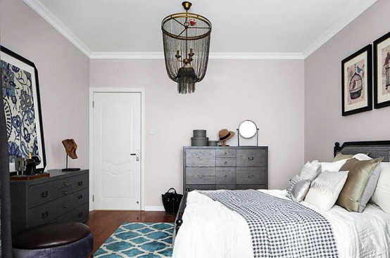 主卧,深色皮质的美式大床与床头柜沉稳而有质感,配以舒适雅致的床品,提升了家居品味。鸟笼造型的吊灯,新颖别致,给空间增添了一份趣味。