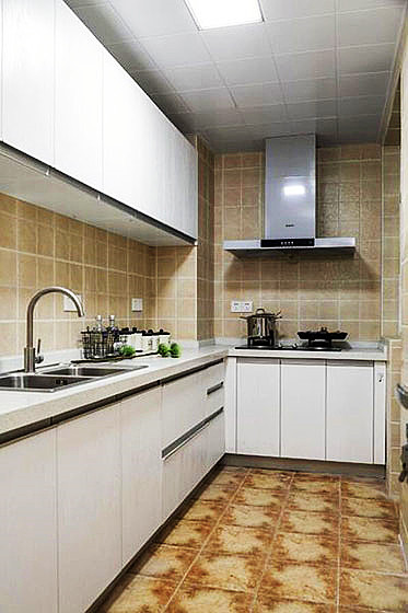 厨房整体以哑光瓷砖铺贴,地面采用花纹砖,与墙面的纯色砖区分,既方便打扫清洁,视觉上也更为清爽、干净,是典型的美式格调。