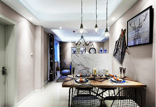 餐厅,深色实木餐桌椅质感满满,搭配铁艺椅子,增强了层次感。精致的水母吊灯,搭配色彩丰富的餐具,赋予了更多生活的意味。