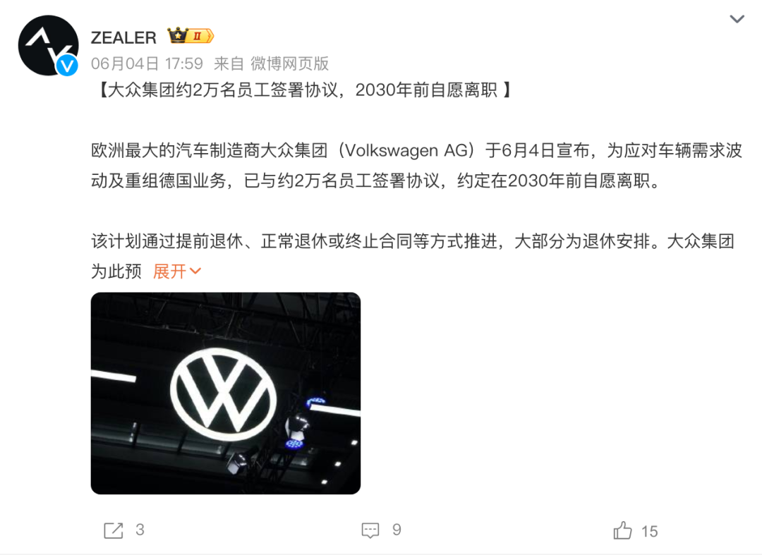 据环球时报援引外媒报道,大众汽车集团表示,作为其德国业务重组的一部分,预计到2030年将有约2万名员工自愿离职。大众汽车表示,此次自愿离职计划覆盖大众乘用车、奥迪、保时捷等多个德国本土品牌及工厂,涉及研发、生产、行政等多职能岗位。