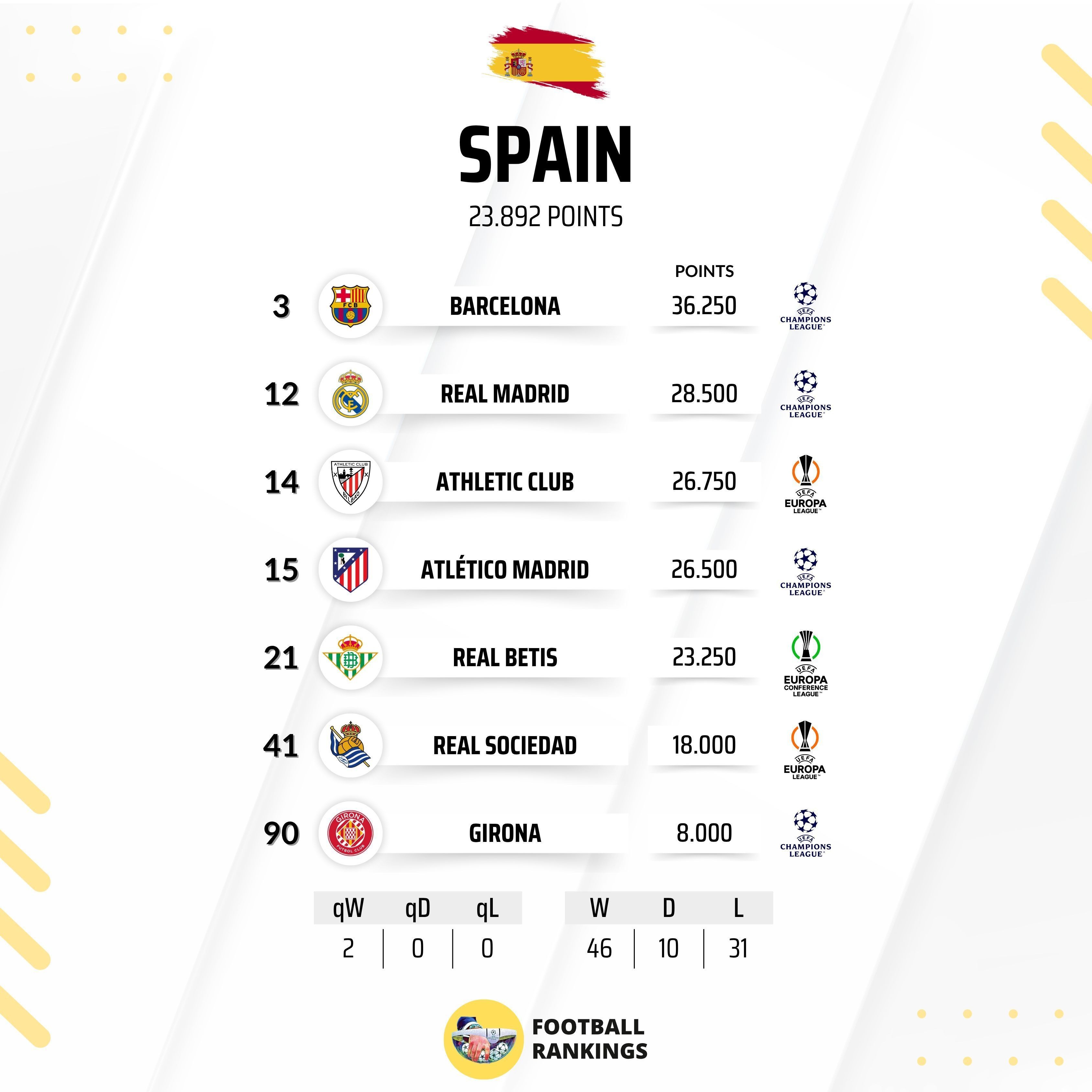 北京时间6月6日,数据机构 Football Rankings 公布了2024/25赛季西班牙俱乐部的欧战积分排名。巴塞罗那以36.250分高居西班牙第一,在全欧排名第3位,紧随其后的是皇家马德里、毕尔巴鄂竞技和马德里竞技。