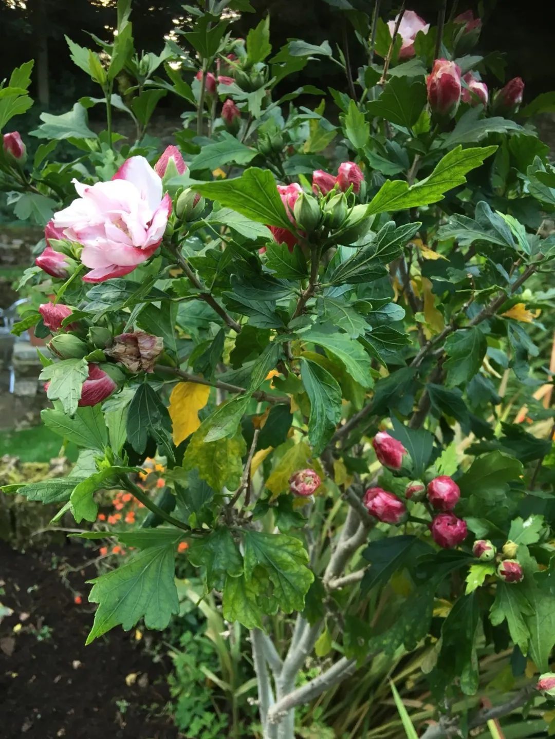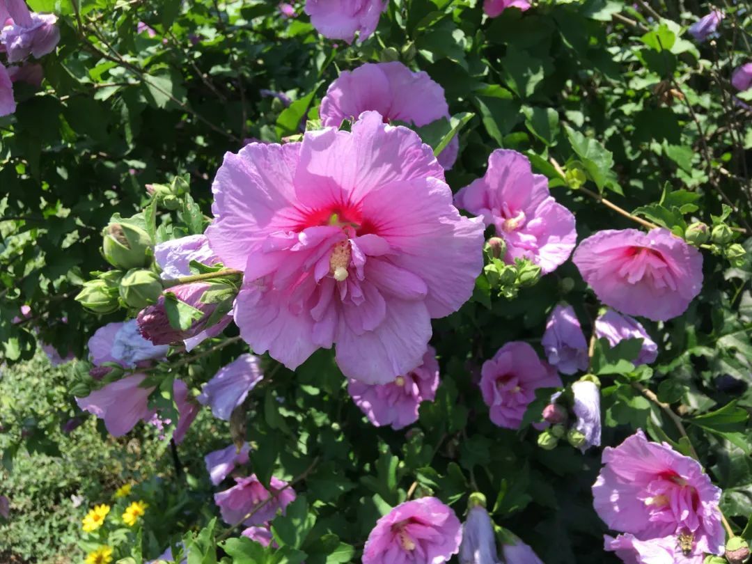 木槿花是一种落叶耐寒灌木(可以忍受零下十多度的低温),植株可以长到2~3米高盆栽,可以适当修剪控制它的植株高度,花色有常见的白色、粉色、紫色等花色。它们的每一朵花只开一天的,但是它的花量极其丰富,在整个夏秋季节都可以持续不断开花。