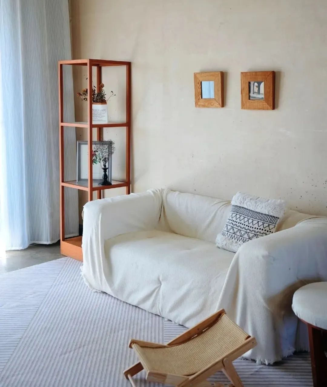 墙面刷了透明墙固防起灰,地面保留原始水泥,铺上驼色地毯瞬间变柔软。二手市场淘来的云朵茶几(200元)+宜家索德汉沙发(二手800元),搭配风扇灯和绿植,竟有几分经典复古风的味道。