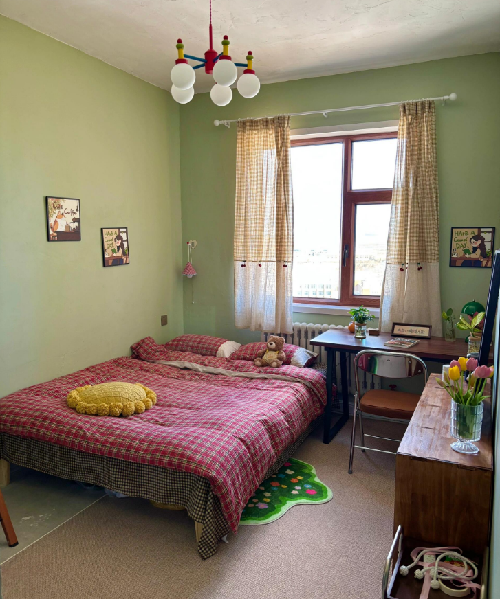 次卧就更出彩了,牛油果色的墙面,实木家具配上红格子被套,明艳又清新。地面铺了地毯,舒适感直接拉满。在预算有限的情况下,还给次卧刷了墙、铺了地,以后有孩子也不怕房间太冷冰冰。