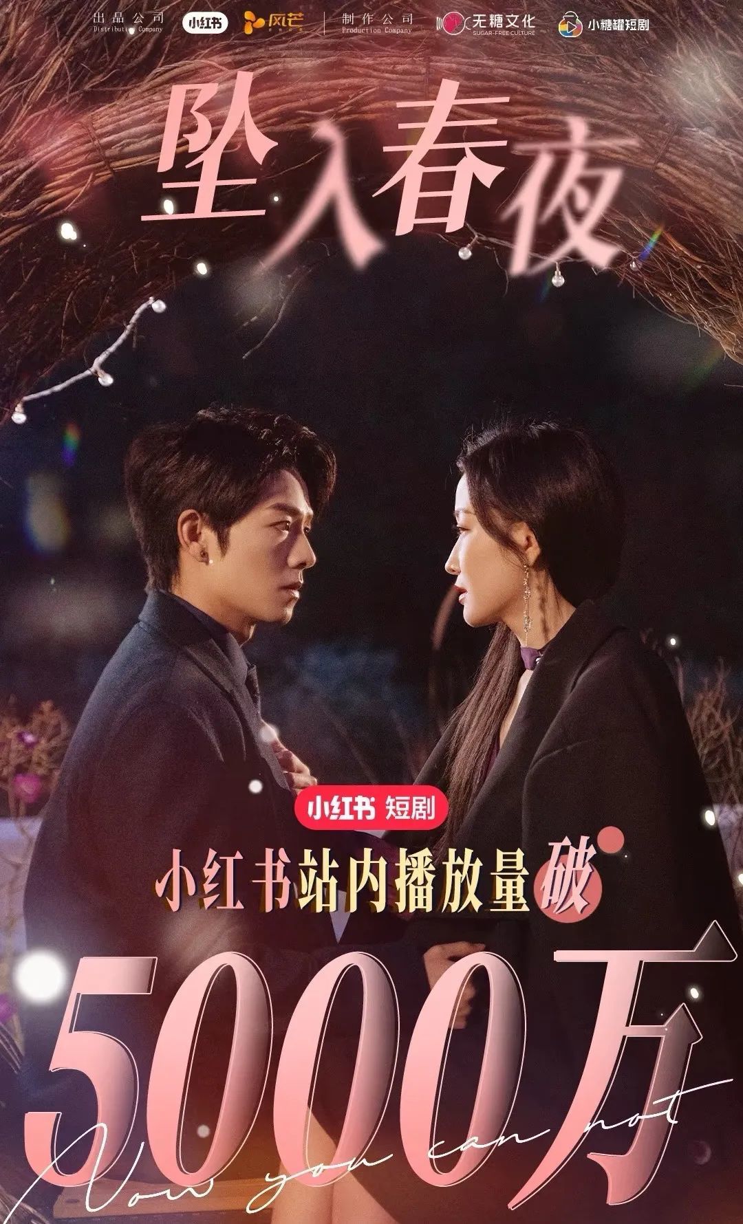在小红书短剧春节档中,成绩最好的就是风芒同步分销的《坠入春夜》,该剧上线48小时站内播放量破1000万,春节档期间播放量突破5000万,目前播放量已破7765万,还略高于《痴人之爱》。这部短剧走的是恶女复仇+甜宠路线,男女主是老搭档曾辉和韩雨彤,两人上演了美女荷官勾引总裁人夫的疯狂爱恋。