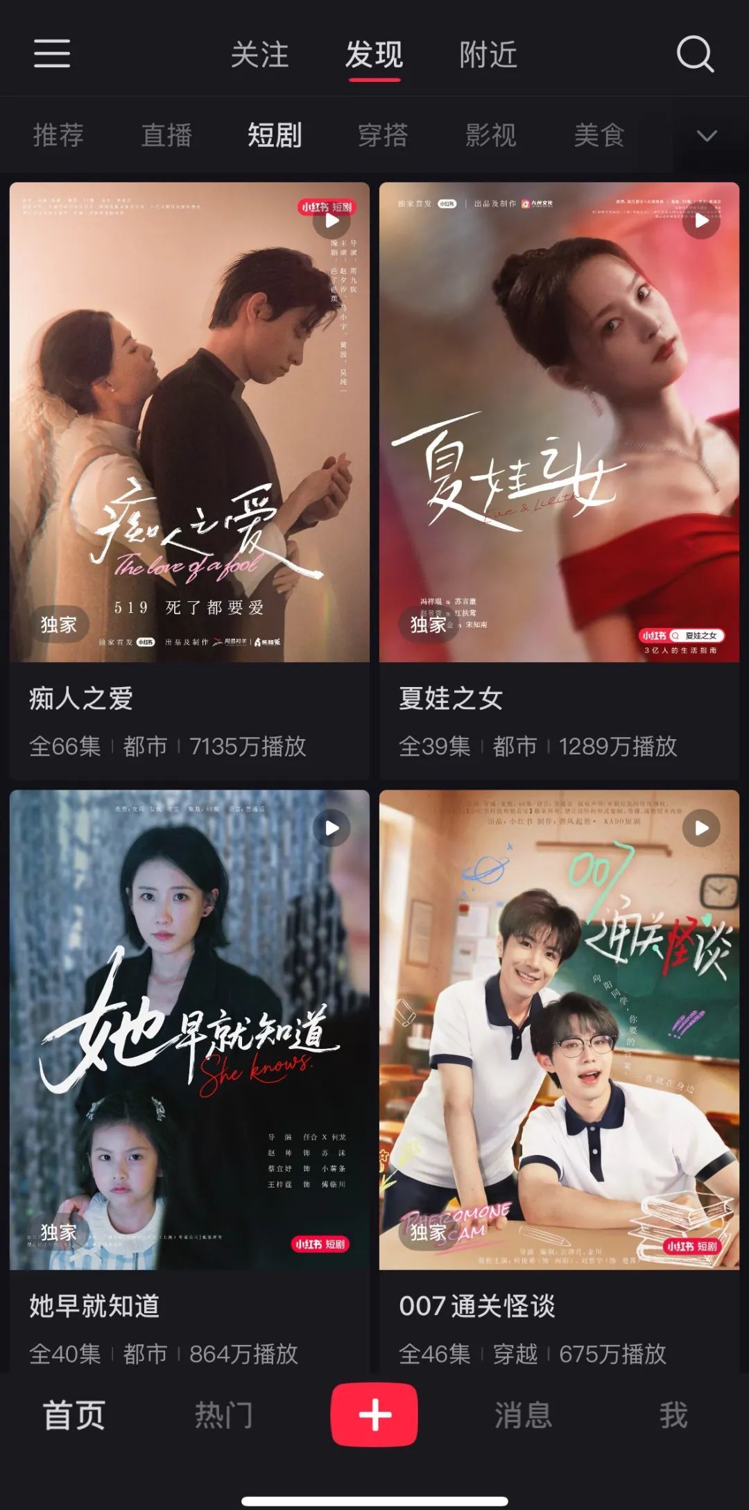 在小红书的界面中,分级频道中已经上线了短剧分类,而在短剧板块下面,前四个短剧都是小红书的独家短剧,也是小红书520档期推出的短剧,分别是《痴人之爱》《夏娃之女》《007怪谈指南》《她早就知道》。如果要归类的话,可以分别归类为女频甜宠、女频复仇+甜宠、系统悬疑+双男主、女频复仇+萌宝。而这些独家短剧也可以代表小红书现阶段对短剧的探索方向。