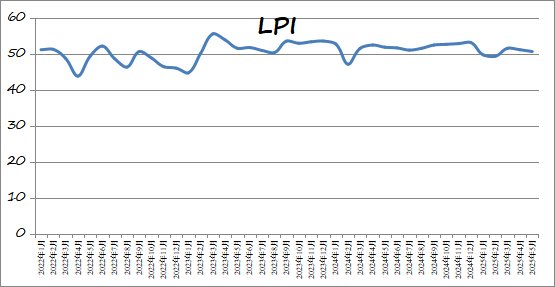 中国物流与采购联合会发布的2025年5月份中国物流景气指数(LPI)为50.6%,环比回落0.5个百分点。其中,业务总量指数、新订单指数、库存周转次数指数、资金周转率指数、固定资产投资完成额指数、从业人员指数和业务活动预期指数等关键指标继续保持在扩张区间,固定资产投资完成额指数、从业人员指数连续回升。