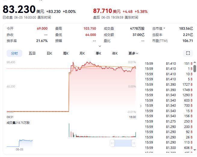 稳定币第一股”如期上市。美东时间6月5日,Circle正式登陆纽交所(股票代码“CRCL”)。其IPO发行价为每股31美元(发行价指导区间为27-28美元),上市首日经历两次熔断后涨幅一度超2倍,盘中股价最高超过103美元。