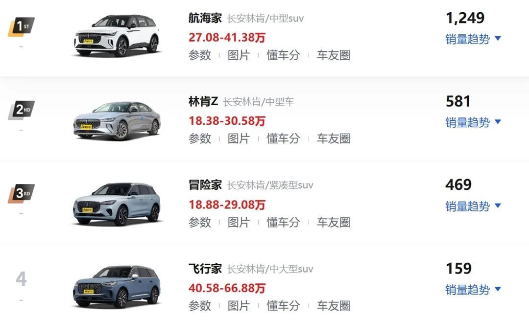 转折点来的太快,刚刚国产的林肯,势头也很不错,但没想到国产新能源车这么猛。猛到如今的冒险家、林肯Z卖到了18.88万,不对,终端的价格还要再低一些。只是即便这样,销量也没上去。截止发稿前,林肯5月份销量还没有公布,咱先看4月份: