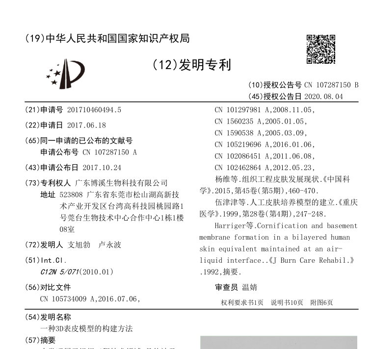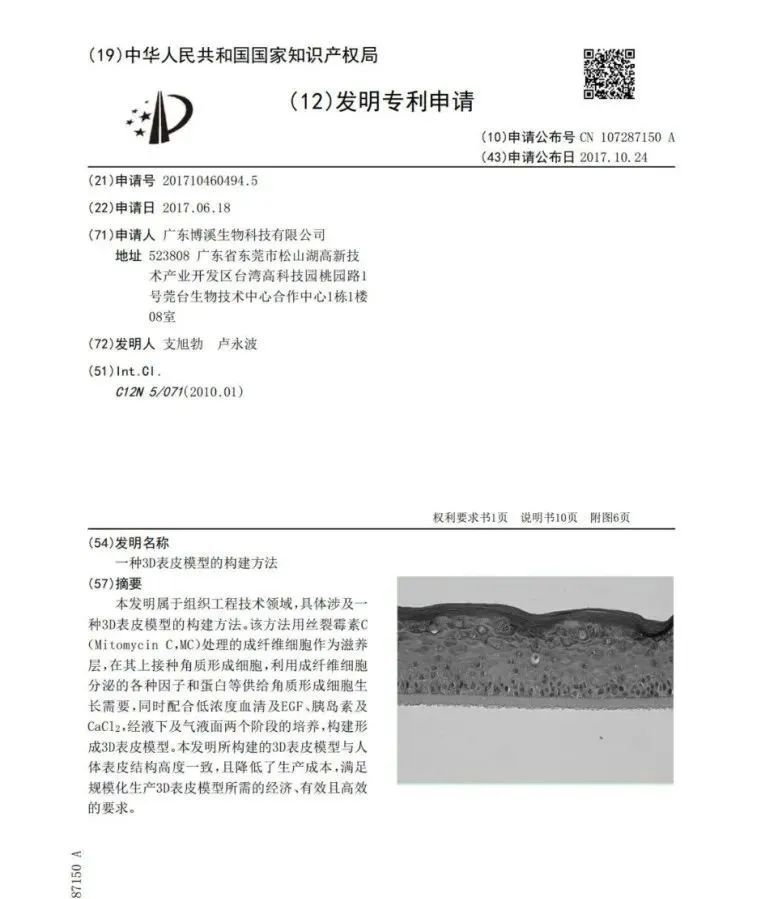 据悉,此处所提及的一种3D表皮模型的构建方法(专利号:ZL201710460494.5),专利持有人为广东博溪生物科技有限公司(佰傲再生为该公司第二大股东,下文称“博溪生物”),发明人系卢永波和支旭勃。