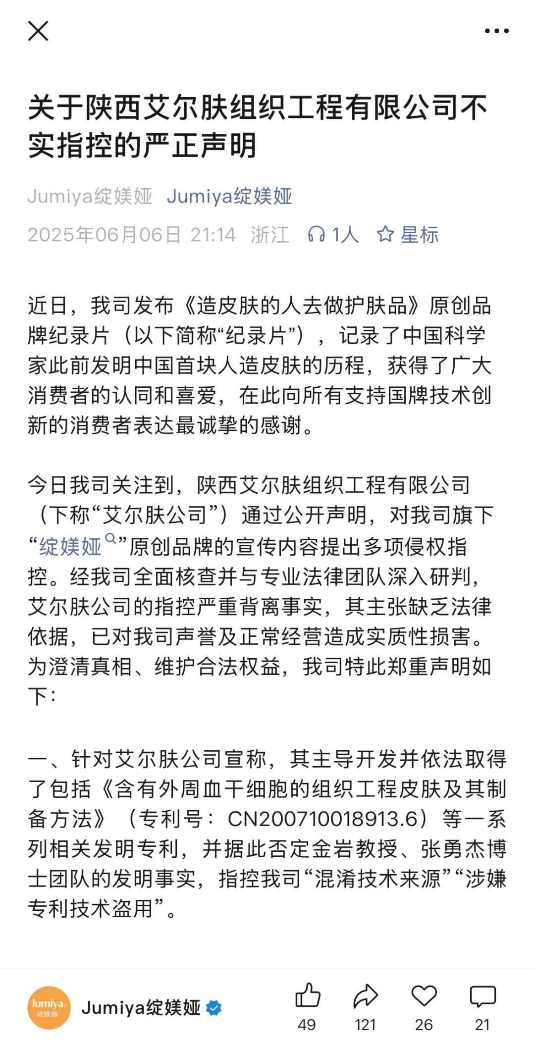 随后于昨日晚间,绽媄娅在官方公众号发布《关于陕西艾尔肤组织工程有限公司不实指控的严正声明》。在该声明中,绽媄娅称,“人造皮肤”、“组织工程皮肤”系列专利发明人为金岩教授、张勇杰博士团队(均为绽媄娅的核心研发带头人),艾尔肤并未“主导研发”,且相关专利均已失效,不存在任何侵权事实。