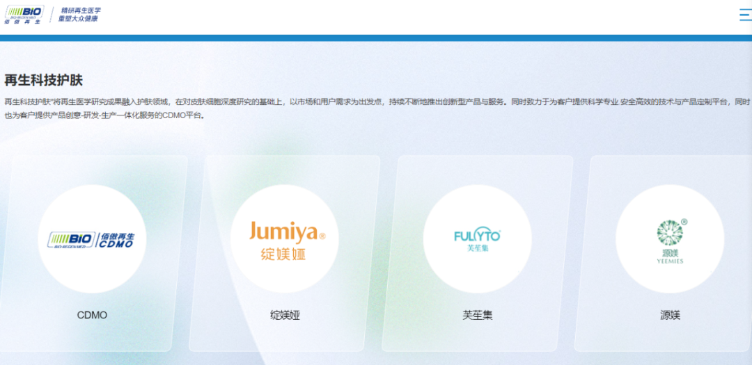 其中,在再生科技护肤领域,佰傲再生主要从事将再生医学研究成果在护肤行业产业化,现已拥有CDMO、绽媄娅、芙苼集和源媄四大品牌。