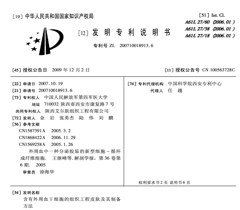 1)艾尔肤宣称,其主导开发并依法取得了包括《含有外周血干细胞的组织工程皮肤及其制备方法》(专利号:CN200710018913.6)等一系列相关发明专利,以此否定金岩教授、张勇杰博士团队的发明事实,还指控绽媄娅“混淆技术来源”和“涉嫌专利技术盗用” ;
