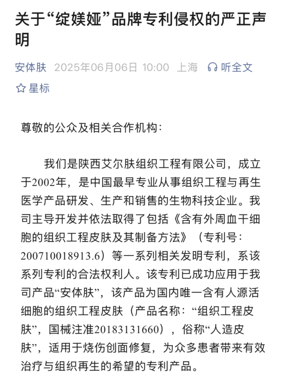 昨日(6月6日),陕西艾尔肤组织工程有限公司(下文称“艾尔肤”)旗下产品安体肤发布一则《关于“绽媄娅”品牌专利侵权的严正声明》(下文称:《声明》)。