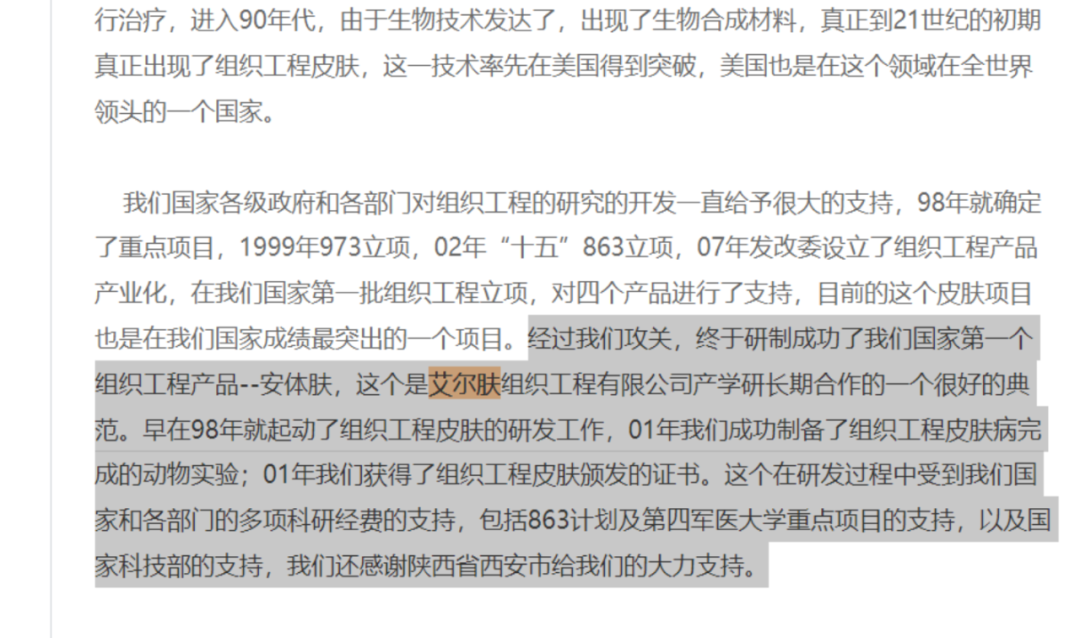 据中国广播网2007年的报道称,金岩教授在第四军医大学精品成果系列展示新闻发布会上透露,“我们团队早在1998年就起动了组织工程皮肤的研发工作,2001年成功制备了组织工程皮肤病完成的动物实验。经过攻关,我们终于研制成功了国家首个组织工程产品——安体肤,这是与艾尔肤组织工程有限公司长期产学研合作的优秀典范……”