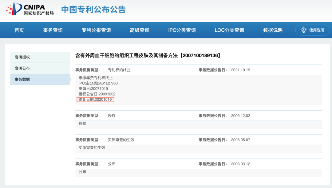 但据国家知识产权局显示,艾尔肤在《声明》中提及的专利“含有外周血干细胞的组织工程皮肤及其制备方法(申请号:CN200710018913.6)”在2007年10月申请,专利权人为中国人民解放军第四军医大学,共同专利权人为艾尔肤,发明人为金岩、张勇杰、陆伟和刘鹏。