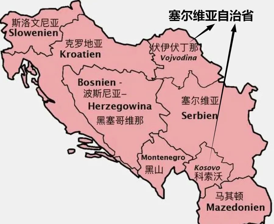 二战后,铁托对南斯拉夫进行了重组。除了塞尔维亚、克罗地亚和斯洛文尼亚之外,黑山、马其顿和波黑得到了“升格”,成为加盟共和国。在塞尔维亚境内,阿尔巴尼亚人占90%的科索沃省,以及匈牙利人占据20%比例的伏伊伏丁那地区,获得了自治省的地位。