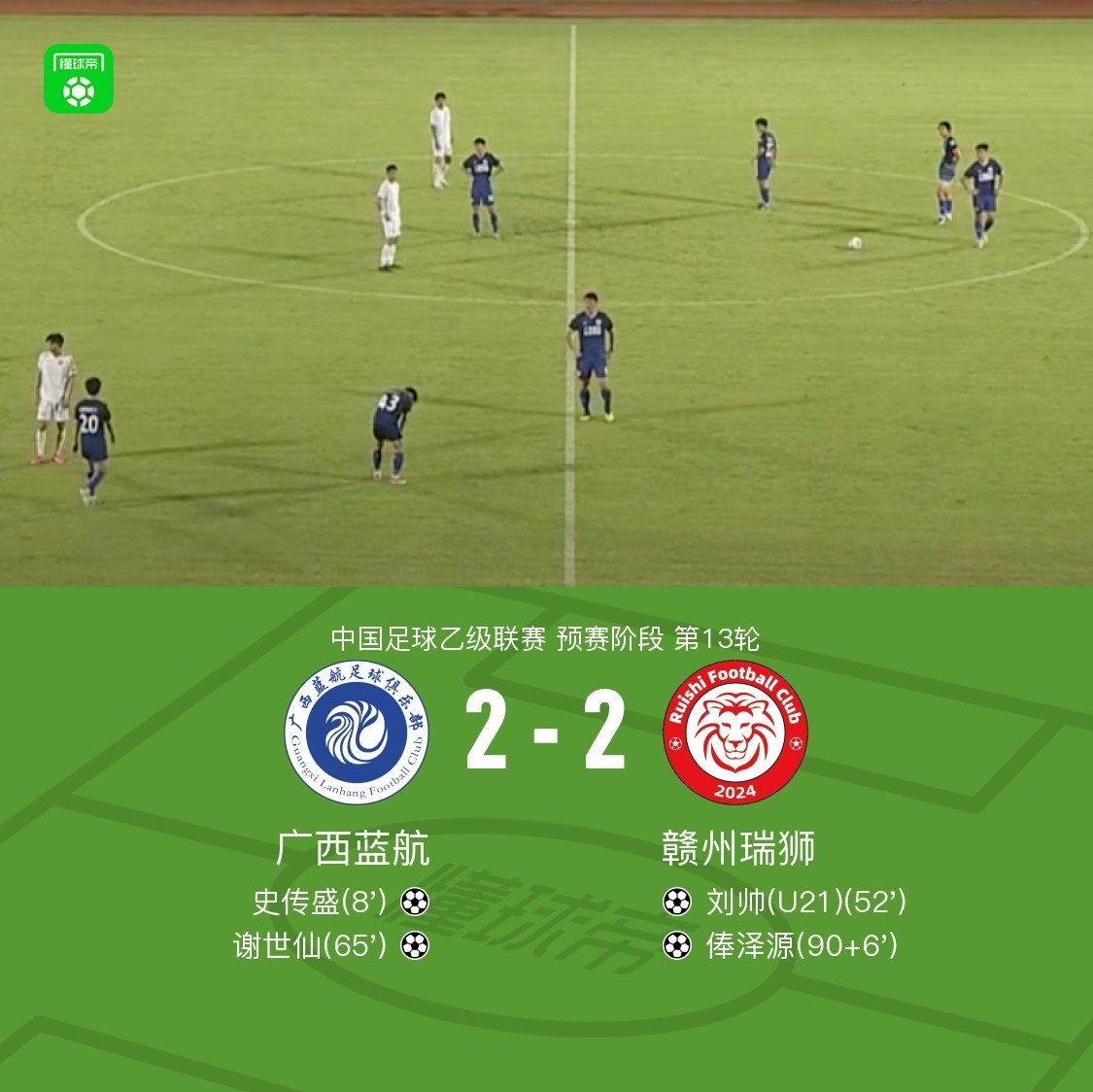 北京时间6月7日,中国足球乙级联赛预赛阶段第13轮,广西蓝航主场迎战赣州瑞狮。比赛中,广西蓝航由史传盛率先建功,谢世仙随后扩大优势。赣州瑞狮方面,刘帅和俸泽源各入一球,帮助球队扳平比分。最终,双方以2-2的比分握手言和。