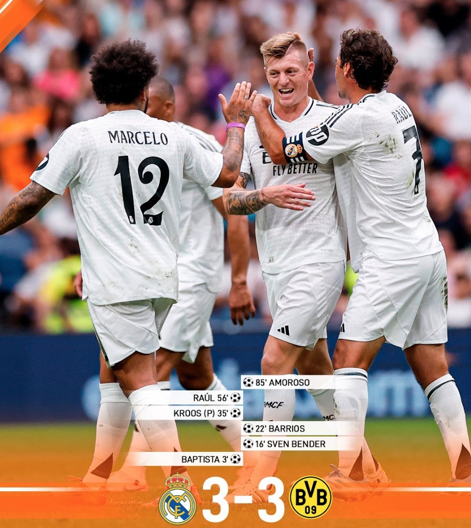 巴普蒂斯塔为皇马首开记录,斯文-本德与巴里奥斯攻入2球,克罗斯点球扳平,劳尔头球反超,阿莫鲁索为多特蒙德将最终比分扳为3-3。