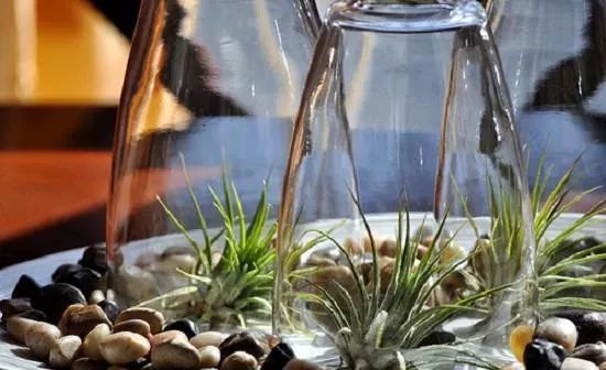 用玻璃杯来增加相对湿度的方法是非常简单的,且非常有效,这个是用于保持小型室内植物的水分,比如上面这些空气凤梨,它们的植株比较小巧,可以直接用玻璃杯罩起来,这样就可以达到保湿保温的效果,杯子是透明的,也不会影响观赏。这样可以提供一个高湿度环境,可以搭配第2种增加湿度的方法来使用。