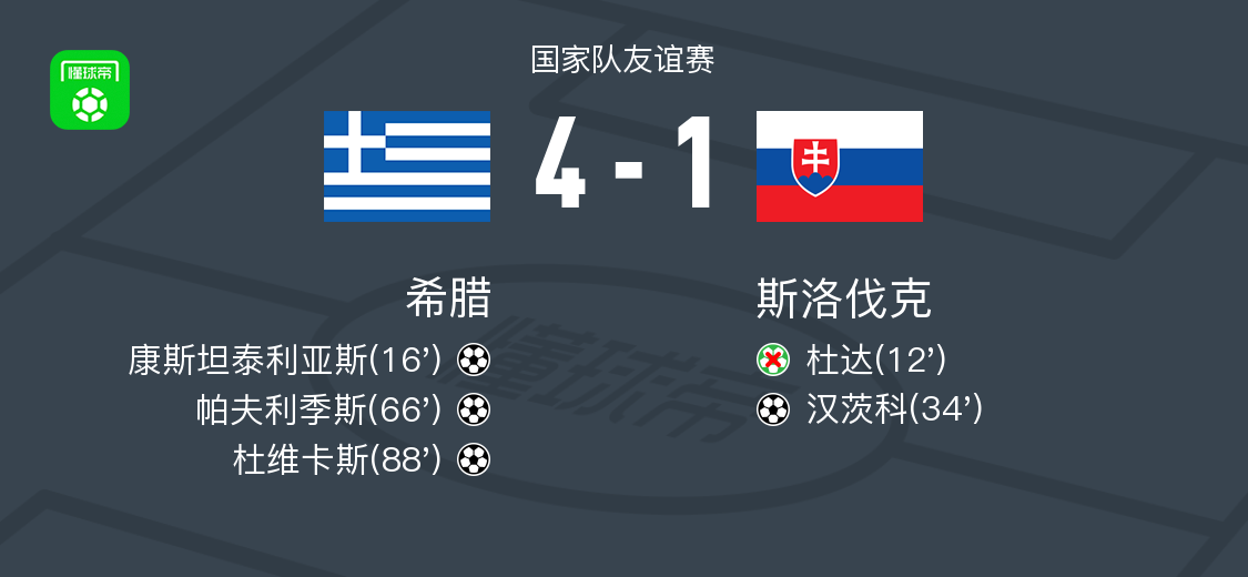 北京时间6月8日国家队友谊赛,希腊对阵斯洛伐克。希腊康斯坦泰利亚斯破门,帕夫利季斯破门,杜维卡斯破门。斯洛伐克汉茨科破门。最终比分希腊 4-1 斯洛伐克。