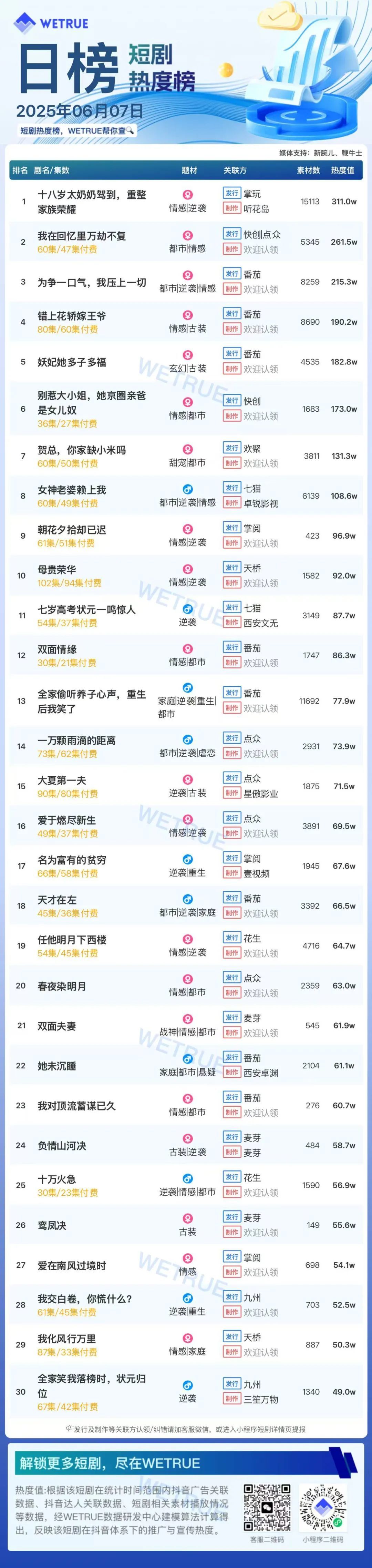 1、本日榜为WETRUE短剧数据公司提供,新腕儿和鞭牛士提供联合支持。