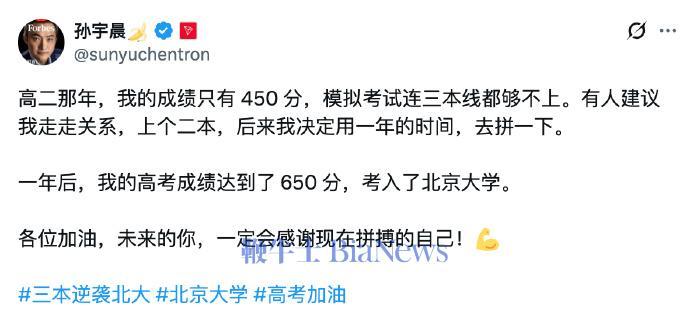 高考之际,孙宇晨发布励志推文鼓励高考生。
