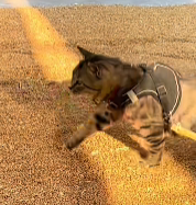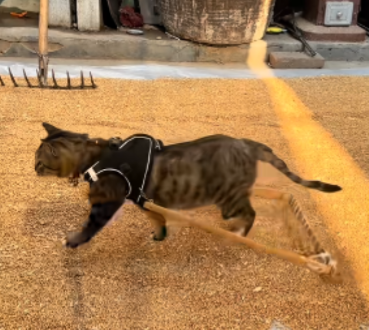 只见视频里,一只狸花猫规规矩矩的拉着小车翻晒麦子,走了一圈又一圈。