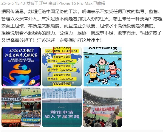 北京时间6月8日,此前网传消息称,苏超联赛拒绝中国足协干涉,不接受任何形式的指导或监督。早些时候,媒体人付政浩在经证实后辟谣称,该新闻完全是编造的谣言和假新闻。