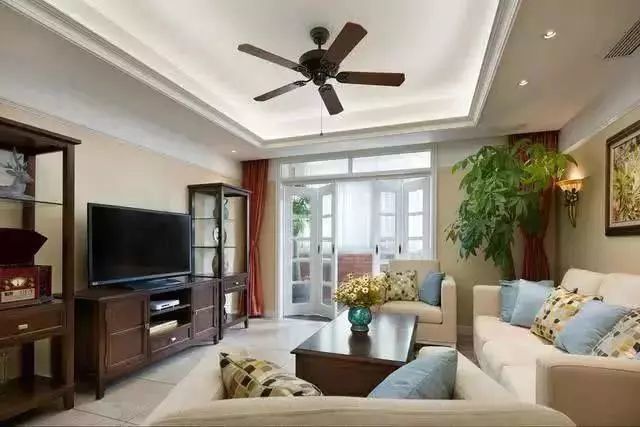 客厅天花板采用吊顶装饰,增加了空间的立体感,客厅连接阳台采光效果好,并装了扇折叠推拉门,折叠门很灵活可收起,不占位置,冬天又有保暖的作用。