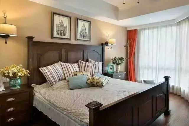 主卧使用的也都是木质家具,结合墙面暖色调装饰很温馨,床头的墙面挂画和床头的花盆装饰,显得格外温馨浪漫。