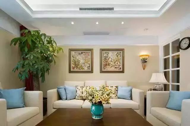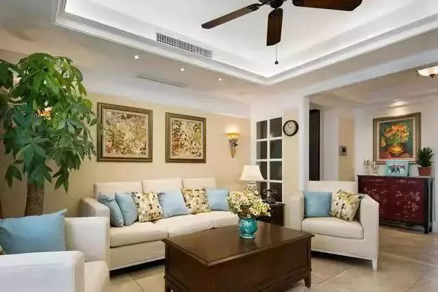 客厅摆放着一套美式布艺沙发,搭配深色实木家具,自然沉稳,墙面用米黄色装饰,暖色调显温馨,在沙发的一旁摆放着一盆绿色植物,清新淡雅,令人感到平静。