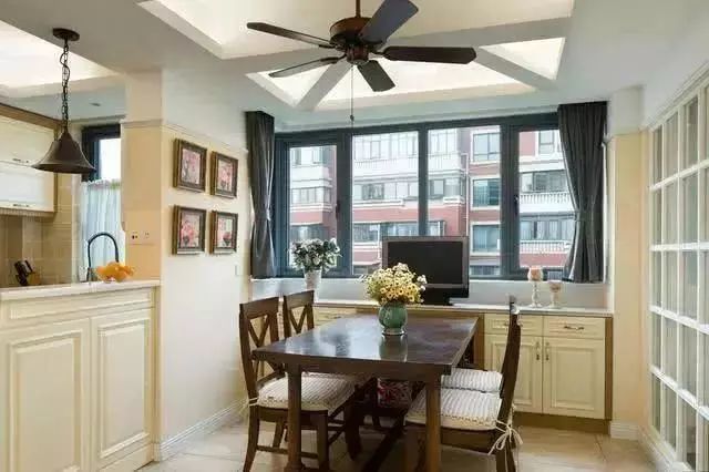 餐厅窗户大采光好,通透明亮,餐厅摆放的是长方形餐桌,自然温馨,窗户下面装了一排储物柜,增加收纳空间,餐厅的吊扇灯,一物两用很实在。