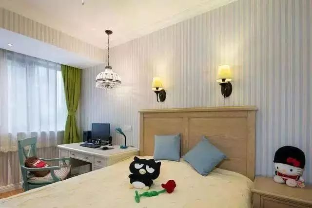 儿童房配色非常可爱温馨,墙面用竖状条纹壁纸装饰清新舒适,床头摆放着一张白色小书桌方便用于学习。