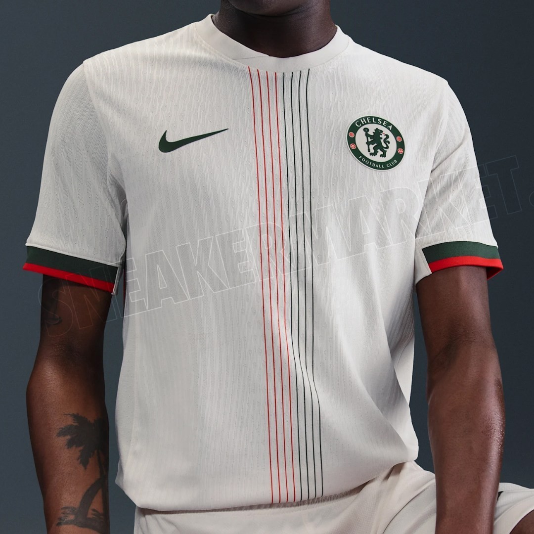 球衣设计:切尔西25/26客场球衣采用灰白色(“幻影”)为主色,搭配深军绿色(“银河翡翠”)和红色细节。