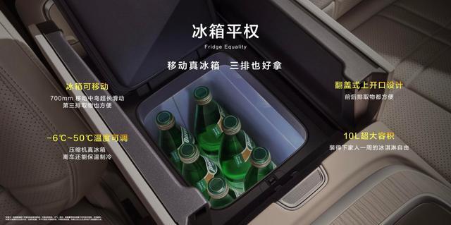 第三排告别凉水!S09自带可滑动700mm的“移动冰吧”,-6℃到50℃随心调,压缩机真冰箱,离车还能保温!10L大肚量装满冰淇淋自由,后排伸手就有冰可乐!另外,后排追剧看巨幕!21.4英寸3K超清屏,16:9黄金比例,0-75°任意调节,外翻设计更安全。配上遥控器,第三排秒变私人影院VIP!扔掉小板凳!第三排是正经大沙发:48.2cm坐垫托大腿,36cm座高不憋屈,125°电动躺倒,3档加热+全皮质!还有220V+Type-C接口,长途刷剧爽歪歪!
