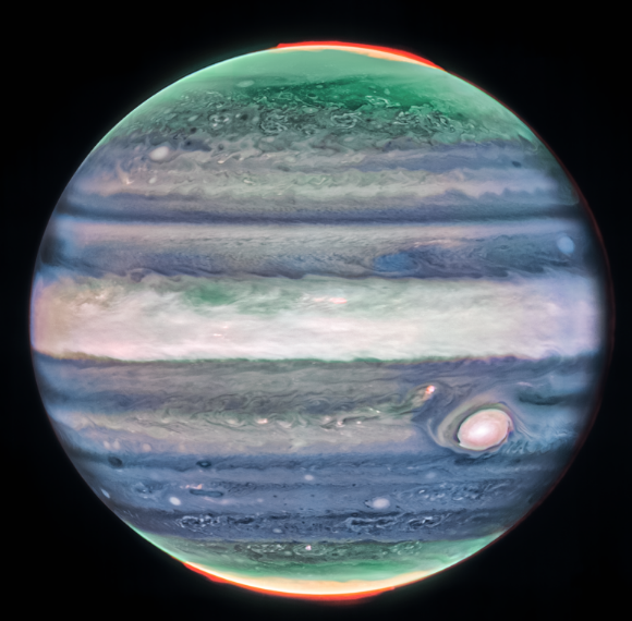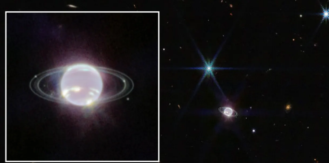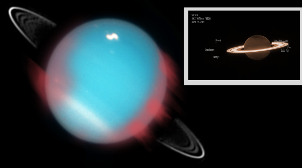 令人惊叹的灯光秀(主图)哈勃望远镜观测到的天王星,加上红光(插图)JWST观测到的土星极光(图片来源:NASA,ESA,CSA,STScl,M。Jiscareno(SETI研究所)。